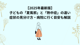 「夏になると子どもが熱を出すことが増えて、夏風邪なのか熱中症なのか迷ったことはありませんか?」→ どちらも発熱があり、判断に迷うママが多いので、見分け方をわかりやすく紹介します!夏風邪とは? 主な原因:ウイルス(エンテロウイルスなど) 主な...