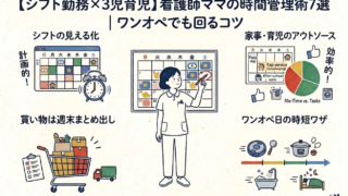 看護師のシフト勤務と3児のワンオペ育児を両立するための時間管理術を7つご紹介。「完璧なスケジュール」ではなく「柔軟に回せる仕組み」を作るコツをお伝えします。